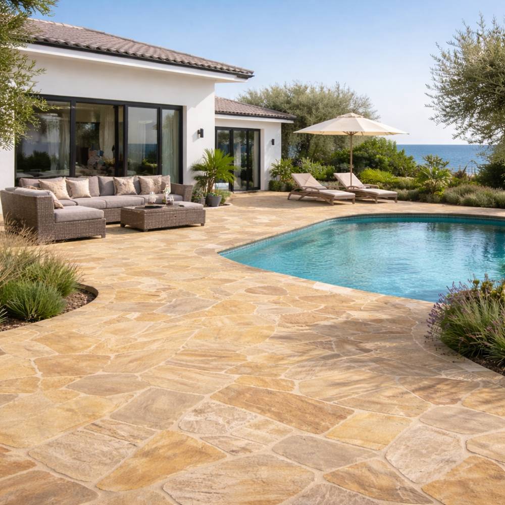 Parmi nos dallages en pierre claire, découvrez dès à présent un revêtement naturel aux teintes chaleureuses : le Quartzite Amarillo Doré. Ce matériau séduit par son élégance naturelle et sa capacité à mettre en valeur les espaces extérieurs.