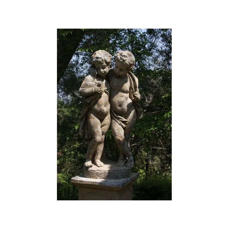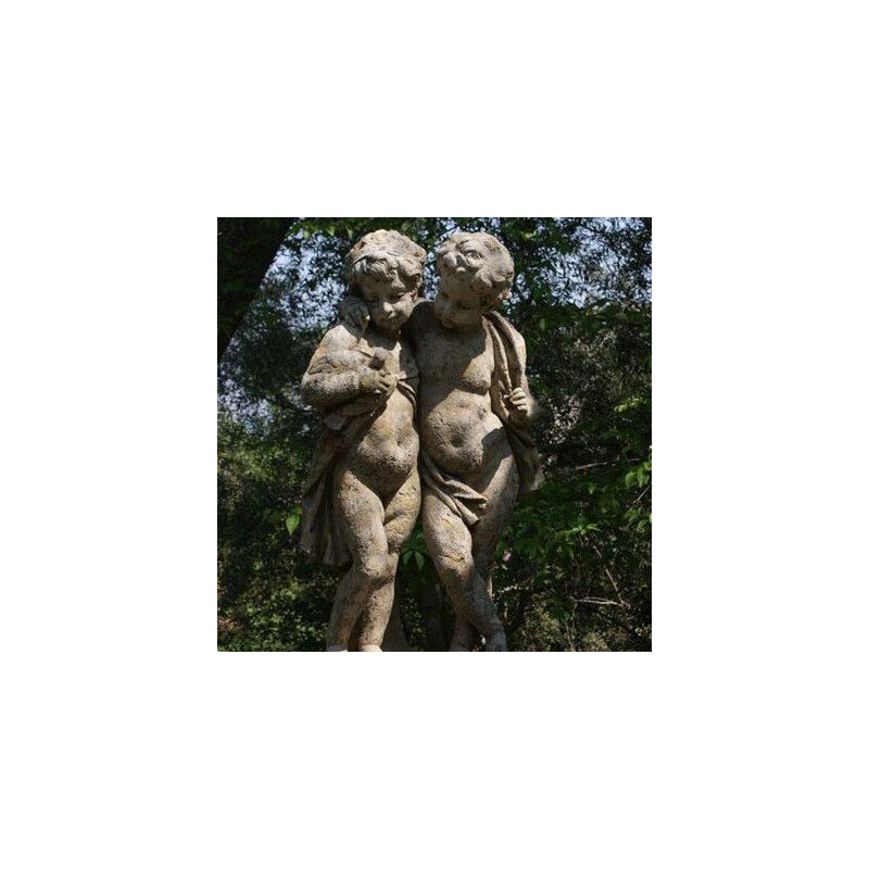 statue de jardin représente deux jumeaux. L’un des deux putto tient un oiseau sous l’avant-bras droit. Cet