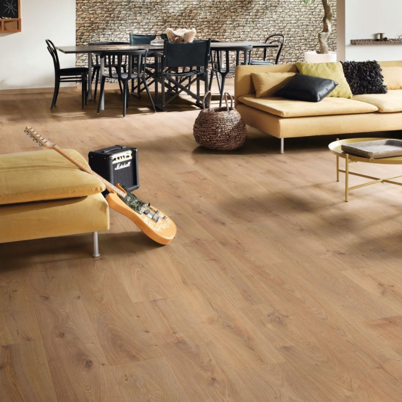 Le stratifié apporte de nombreux avantages de par sa composition et son rendu esthétique. La couche d'âme en fibre de bois, apporte la densité et de ce fait le confort acoustiques et l'isolation. La couche d’usure, quant à elle, est composée de cellulose spéciale imprégnée de résine, ce qui confère au stratifié sa robustesse et cet effet visuel ressemblant à si méprendre à celui du chêne. Ce revêtement de sol stratifié de 7 mm est idéal pour les pièces à faible et moyen trafic, apportant une solution économique et élégante pour les salons, chambres, couloirs et bureaux. En raison de son faible profil (7mm), il peut être une excellente option pour la rénovation, car il peut souvent être installé sans avoir à ajuster les portes ou les seuils existants. Avec son système de pose clipsé, ce revêtement de sol stratifié effet bois 7 mm d'épaisseur s'installe en toute simplicité et rapidement. Si vous souhaitez un sol stratifié avec une épaisseur plus importante, nous vous proposons le sol stratifié 8 mm aspect bois ou encore le sol stratifié 10 mm imitation bois .Les variations disponibles pour ce sol stratifié effet bois